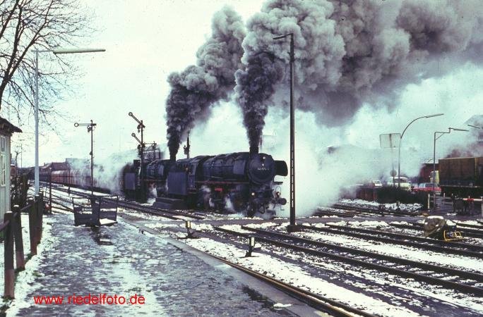 Im Sommer 1976 wartet die 042 024-0 mit einem Güterzug im Bahnhof Lingen auf die Ausfahrt in Richtung Norden, im Hintergrund der Wasserturm des dortigen Ausbesserungswerkes. Direkt hinter der Lok ist ein Haus-zu-Haus-Behälterwagen eingereiht, der sicherlich eine eigene Aufnahme wert gewesen wäre, aber damals war ich noch völlig auf Dampfloks fixiert... Horst Lüdicke
