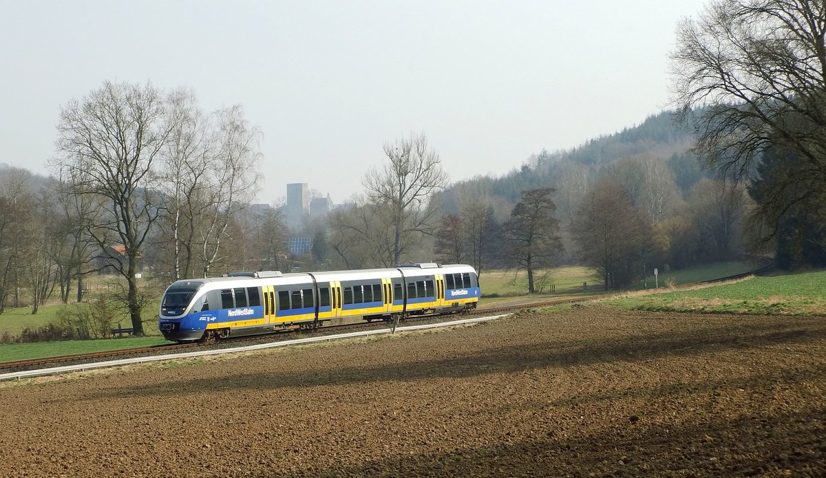 Am 23.03.2015 hat der Triebwagen VT 643 304 der NordWestbahn Adelebsen verlassen und fährt in Richtung Bodenwerder.