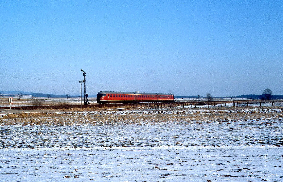 Im flachen Harzvorland passiert ein 613 im Februar 1985 das Einfahrtssignal von Hattorf (Strecke Herzberg - Northeim)
