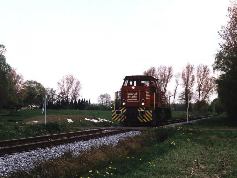 D23 der Bentheimer Eisenbahn AG mit Übergabegüterzug 209 zwischen Coevorden-De Heege (Die Niederlande) und Nordhorn bei Neuenhaus am 7-5-2001. Bild und scan: Date Jan de Vries. Date Jan de Vries