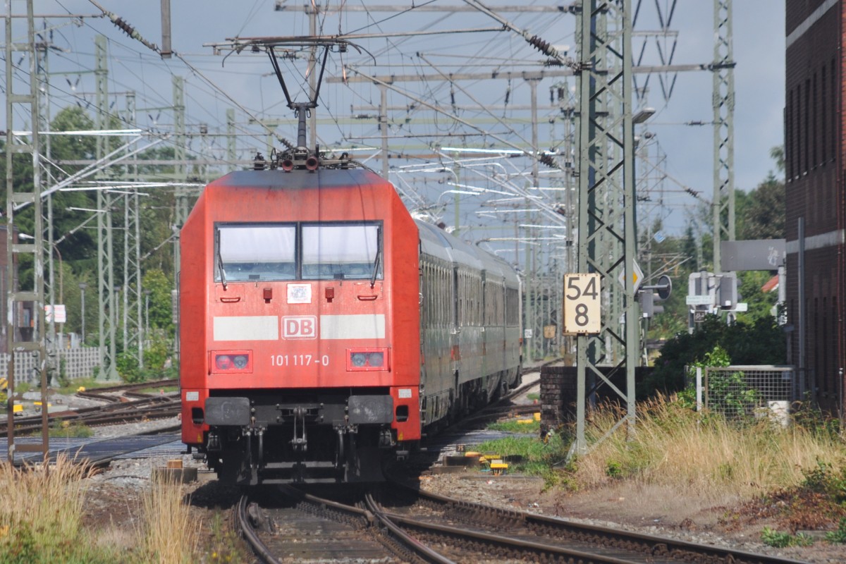 LEER/Ostfriesland (Landkreis Leer/Ostfriesland), 18.08.2013, 101 117-0 mit IC 2432 nach Norddeich Mole bei der Ausfahrt