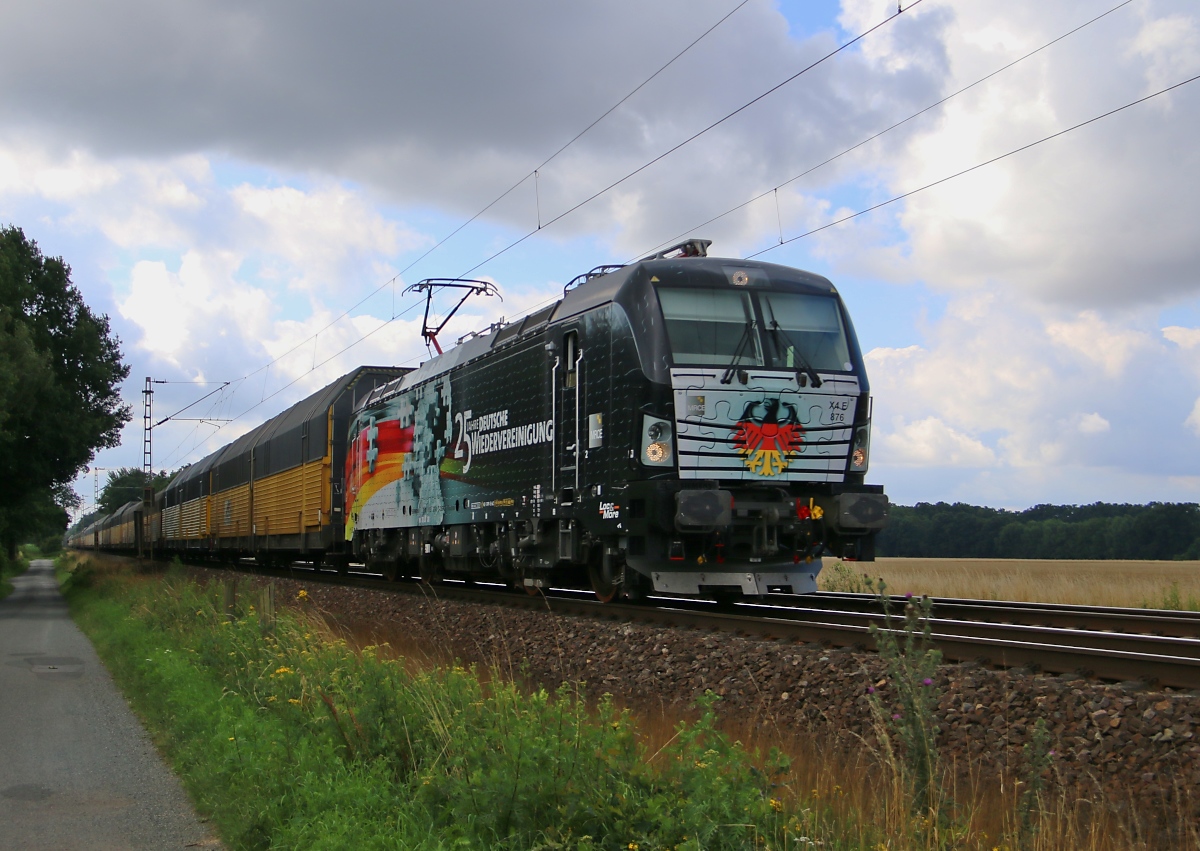 Der Adria Taurus 1216 921-7 "Tamara" bespannte am 23.07.2015 einen Autotransportzug in Richtung Verden(Aller). Am Zugschluss hing noch die Wagenlok 185 677-2. Aufgenommen in Eystrup. Jens Baumhauer