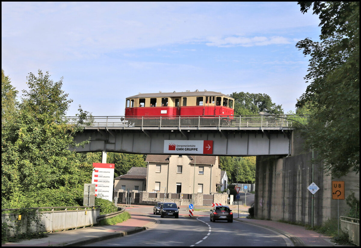 Am 7.9.2024 u 10.49 Uhr überquert hier der historische VT 03 von Eisenbahn Tradition die werksinterne Verbindungsbrücke im Stahlwerk Georgsmarienhütte über die Malbergener Straße.