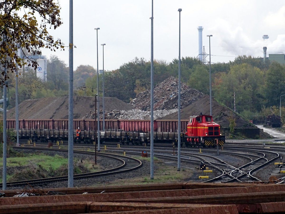 Die Lok GMH 7 (MG530C von Klöckner-Humboldt-Deutz) der Georgsmarienhütten-Eisenbahn rangiert einen Zug mit Stahlstangen, die später von der DB abgeholt werden sollen. Blick in den Hüttenbahnhof, das Foto wurde von einer öffentlichen Straßenbrücke aus aufgenommen. 02.11.2018