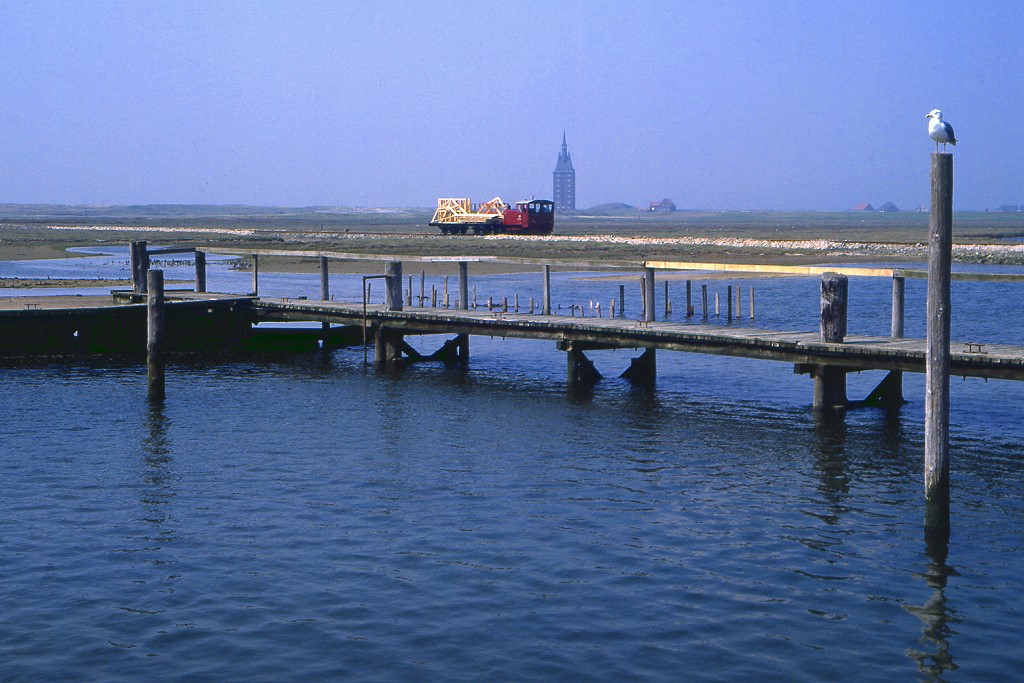 Blick von der ablegenden Fähre auf den Anleger der Juister Inselbahn im Mai 1981. Neben einem Personenzug ist rechts auch die Lok "Karl" zu sehen. Wegen der Strömungsverhältnisse lag der Anleger weit im Wattenmeer und führte über eine rund 600 m lange Pfahlbaustrecke durch das Watt auf die im Hintergrund sichtbare Insel.