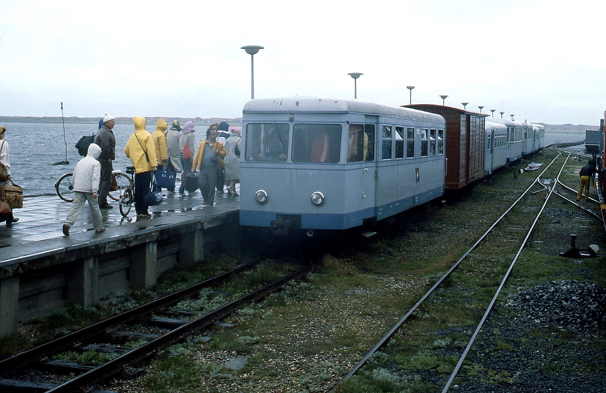 Von ziemlich unfreundlichem Wetter wurden die Urlauber an diesem Maitag 1981 auf der Insel Juist empfangen. Kein Wunder, dass sie es (bis auf den Fotografen) eilig hatten, in die Wagen der Inselbahn zu kommen, die sie über die Pfahlbaustrecke durch das Watt in den Ort bringen wird. T 2 am Zugschluss ist schon ziemlich gut besetzt. Nach dem Bau eines ortsnahen Hafens wurden Anleger und Strecke überflüssig und die Inselbahn 1982 stillgelegt. T 2 blieb aber erhalten und ist heute im Besitz des DEV (Bruchhausen-Vilsen).