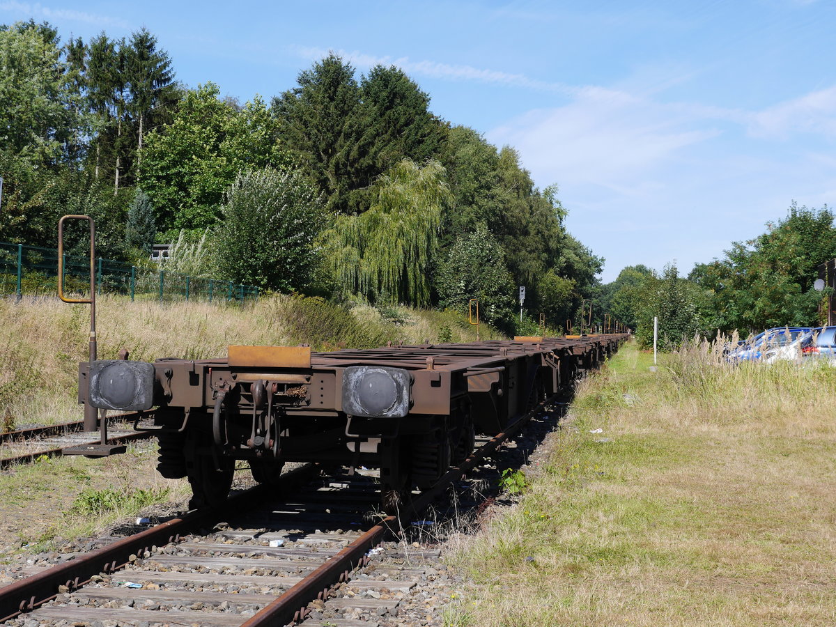 Abgestellte Flachwagen im Gelände des Bahnhof Amelinghausen-Sottorf ex KBS 104 h /109 b / 162 ("Gebirgsbahn" Lüneburg - Soltau); 31.08.2016
