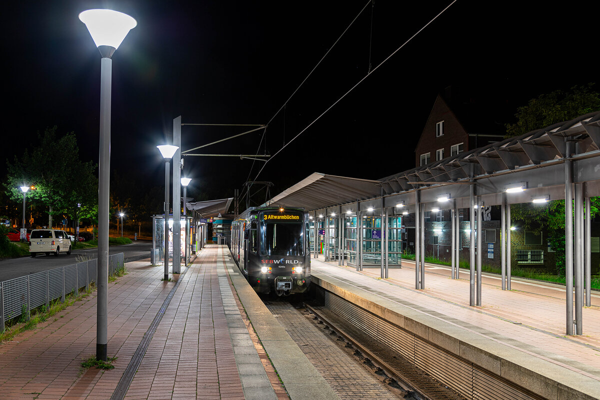 Seit dem Fahrplanwechsel 2022 kommen bei der ÜSTRA im Spätverkehr auf einigen Linien vermehrt Einzelwagen zum Einsatz, so auch auf der Linie 3 am Abend des 13.05.2024, hier vertreten durch den Wagen 6248 am Endpunkt Wettbergen. Henri Kliemt