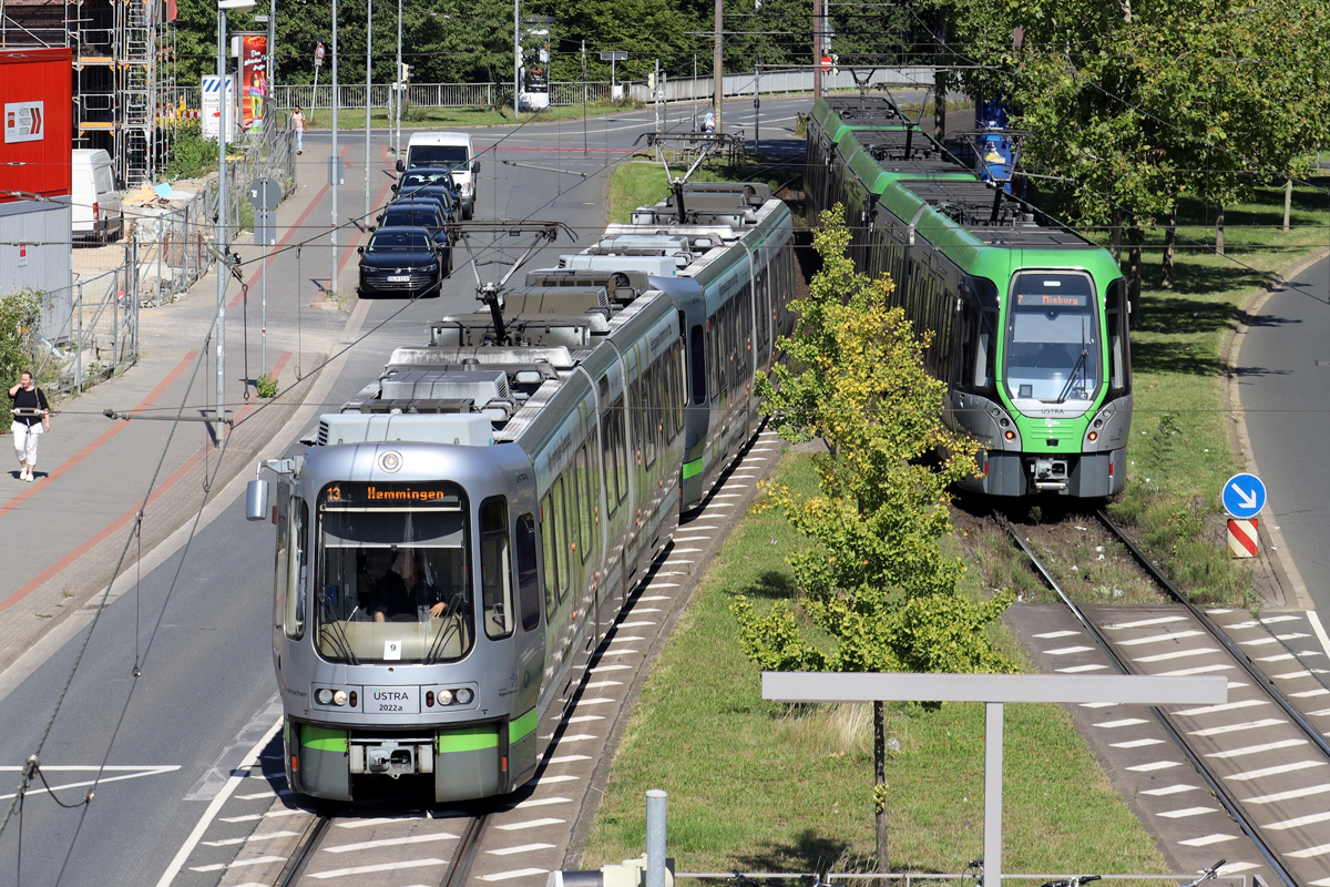 Seit Anfang Juli 2024 ist Wagen 3126 der ÜSTRA als Vielfalts-Bahn auf Hannovers Schienen unterwegs. Mit den Slogans "Wir fahren für Toleranz" und "Wir bringen Vielfalt auf die Schiene" wirbt der Wagen im Rahmen der Kampagne #buntfährtbesser für ein offenes Miteinander. Am Abend des 4. September 2024 konnte ich das Fahrzeug vor einer Überführungsfahrt zusammen mit dem Wagen 3061 in der Ausfahrt des Betriebshofes Buchholz ablichten. Henri Kliemt