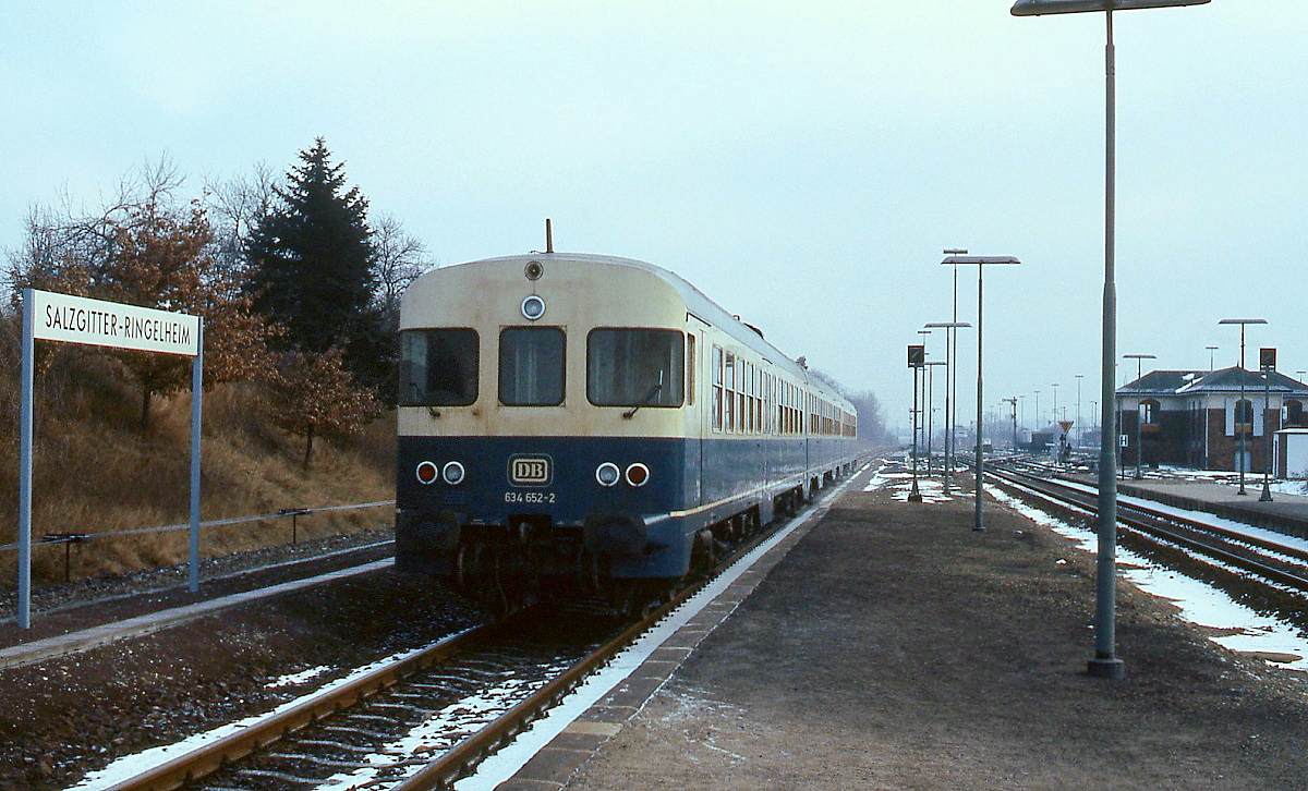 Ein 613 von Kreiensen nach Braunschweig fährt im Februar 1985 in Salzgitter-Ringelheim ein. Im Gegensatz zur links sichtbaren Verbindung von Hannover nach Goslar ist diese Strecke bereits auf eingleisigen Betrieb zurückgebaut worden. Horst Lüdicke