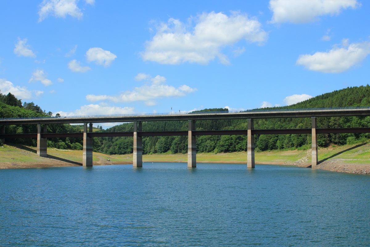Wegen Sanierungsarbeiten am Haupt- und Vordamm musste der Wasserstand im Biggesee in diesem Sommer um fünfzehn Meter abgesenkt werden. Dadurch entsteht ein ganz anderer Blick auf die Brückenbauwerke, wie hier die kombinierte Eisenbahn-/Straßenbrücke über das Dumetal (06.07.2015). Leider wird auch die Bahnstrecke von Finnentrop nach Olpe saniert, daher verkehren während der Sommerferien in Nordrhein-Westfalen keine Züge. Horst Lüdicke