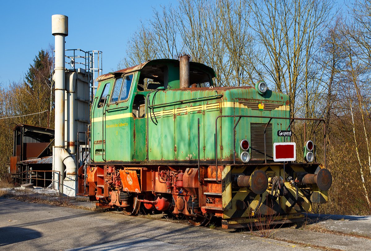 Die Werkslok "Grevenbrücker Kalkwerke 3" (heute Rheinkalk Grevenbrück GmbH) eine Krauss Maffei M 250 B abgestellt am 27.02.2016 in Lennestadt-Grevenbrück .