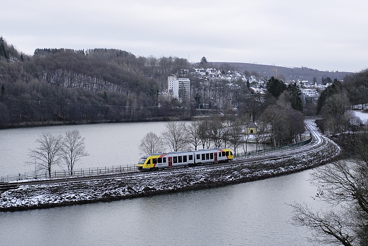 An diesem trüben 14.01.2021 ist der HLB-VT 259, der gerade Olpe verlassen hat und sich als RB 92 auf den Weg nach Finnentrop macht, der einzige Farbtupfer in dieser merh oder minder grauen Landschaft Horst Lüdicke
