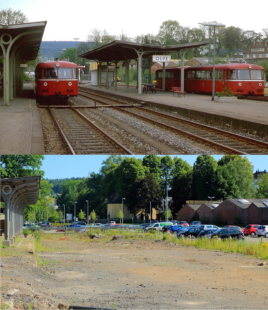 Der Bahnhof Olpe am 03.09.1978 und am 06.07.2015. Damals war Olpe noch ein Nebenbahnknotenpunkt: Von hier ging es nach Finnentrop, Dieringhausen und über Freudenberg zur Siegstrecke. Heute fahren zwar noch Züge nach Finnentrop, allerdings wurde die Abfahrtsstelle vor zwei Jahren um etwa 100 m nach Norden verlegt, damit entfiel auch die kurze fussläufige Verbindung zum Zentralen Omnibusbahnhof. Horst Lüdicke