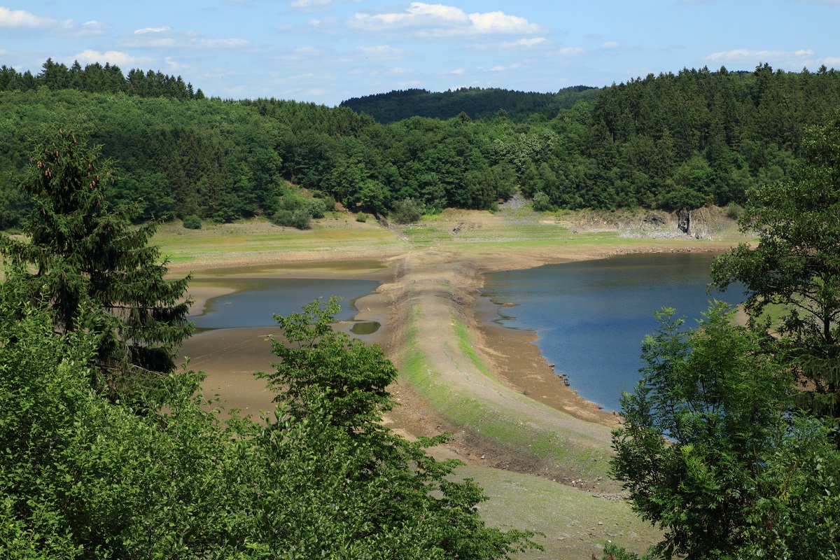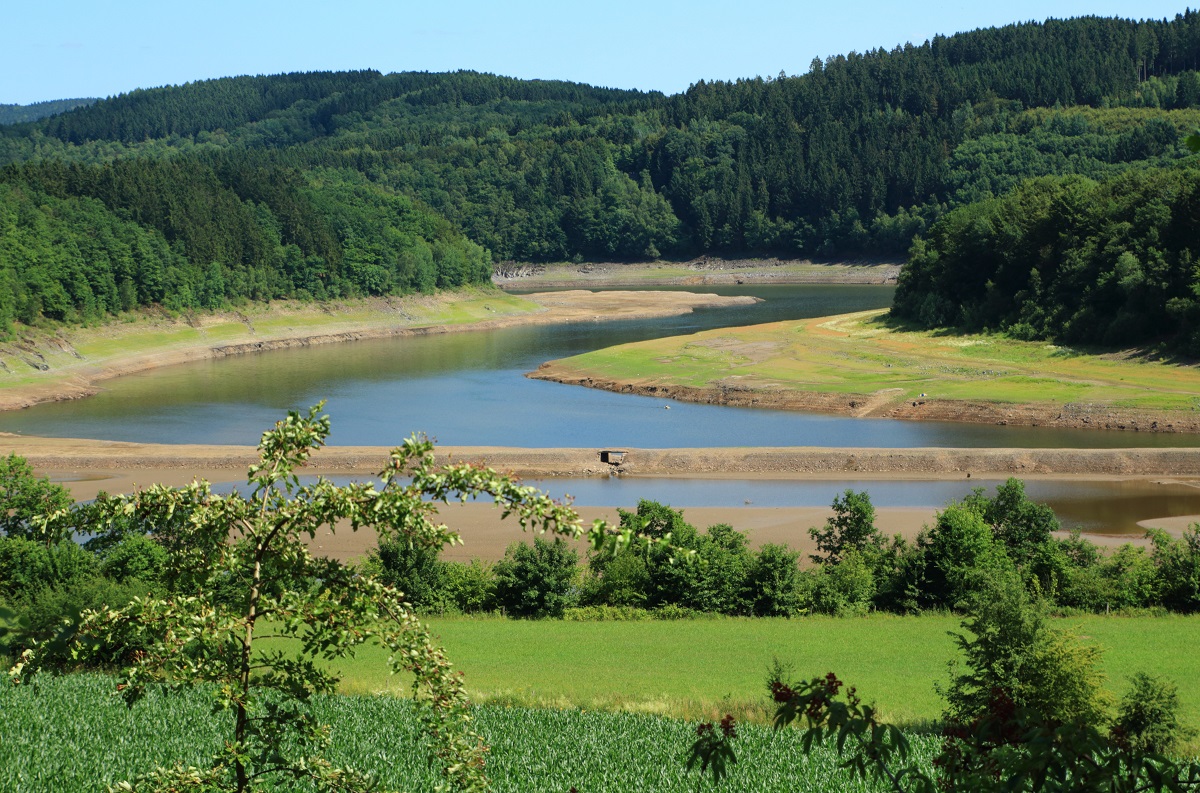 Im Zusammenhang mit dem Bau der Biggetalsperre vor fünfzig Jahren wurde die Bahnlinie zwischen Attendorn und Olpe neu trassiert. Wegen der Absenkung des Wasserstandes aufgrund der Sanierungsarbeiten am Haupt- und Vordamm tauchte der Bahndamm der ursprünglichen Strecke zwischen Sondern und Eichhagen jetzt wieder aus den Fluten auf. Die neue Strecke verläuft zwischen der Wiese und der Talsperre, sie ist aber durch das Laubwerk verdeckt (Aufnahme vom 06.07.2015). Horst Lüdicke