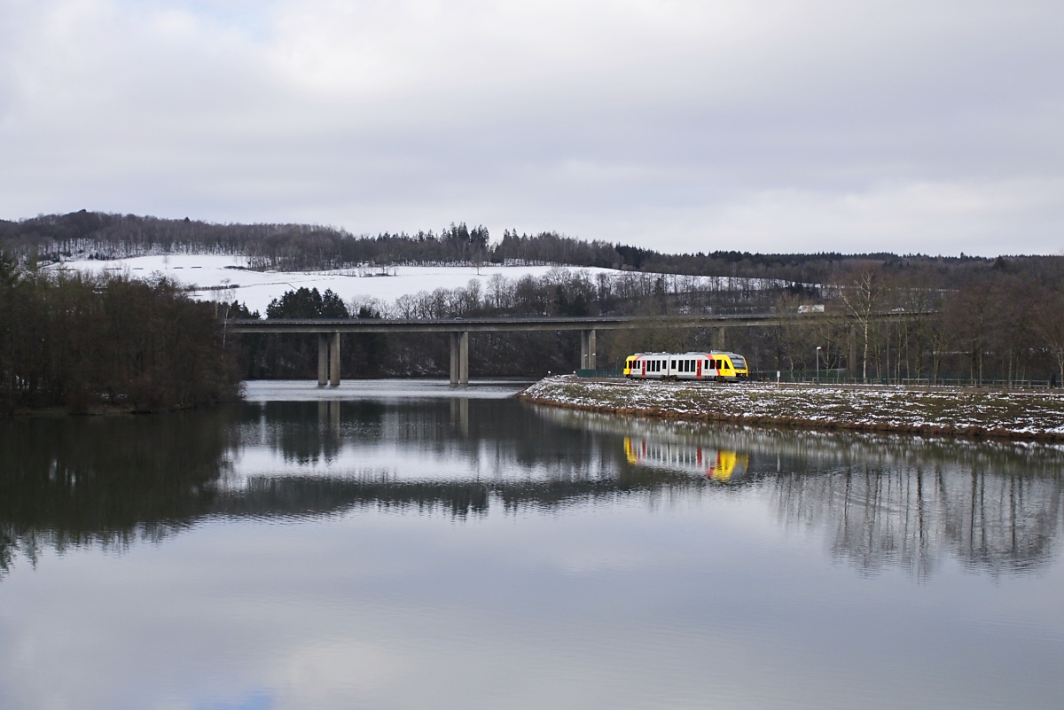 Verschneit zeigt sich die Landschaft um die Biggetalsperre am Nachmittag des 20.01.2024, als der VT 505 der Hessischen Landesbahn aus dem Haltepunkt Sondern nach Finnentrop ausfährt Horst Lüdicke