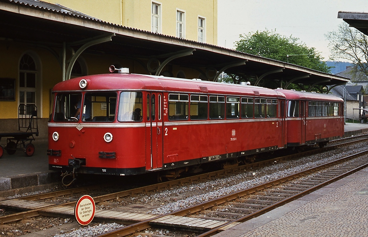 Portrait des 795 350-1 mit einem Beiwagen der Baureihe 995 am 03.09.1978 im Bahnhof Olpe. Das ehemalige Bahnhofsgebäude steht zwar noch, aber heute liegen hier keine Gleise mehr. Die Strecke von Finnentrop endet heute einige Meter weiter nördlich in einem Stumpfgleis vor einem Kreisverkehr. Horst Lüdicke