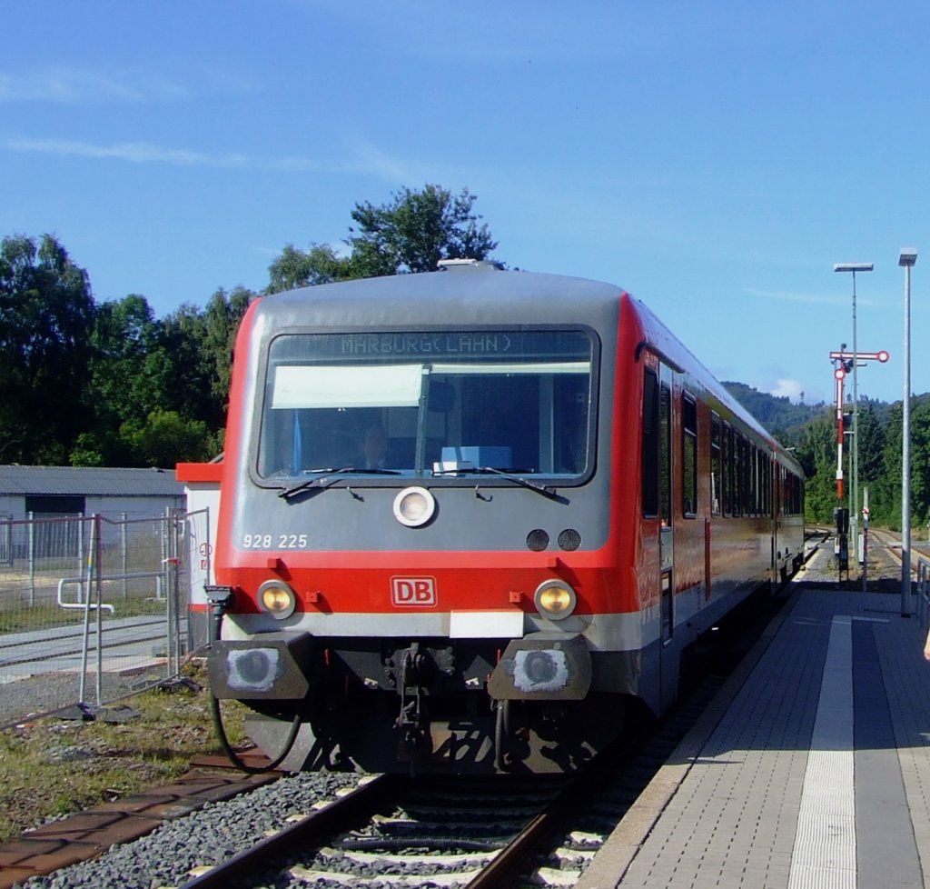 Dieseltriebwagen 628/928 235 der Kurhessenbahn als RB 43 Obere Lahntalbahn (KBS 623)kommt von Marburg über Biedenkopf und fährt am 28.12.2011 in den Bf Bad Laasphe ein, nach dem Halt fährt er weiter Erndtebrück. Armin Schwarz
