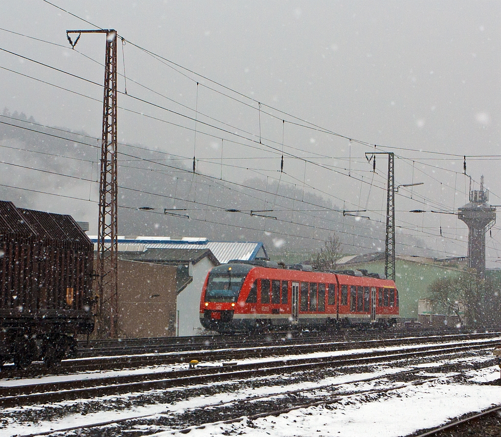 Bei stärkerem Schneefall - Dieseltriebwagen 648 204 / 704 (Alstom Coradia LINT 41) der DreiLänderBahn als RB 95 (Au/Sieg-Siegen-Dillenburg), fährt am 25.02.2013 hier bei Siegen-Kaan (Siegen-Ost) in Richtung Dillenburg. Armin Schwarz