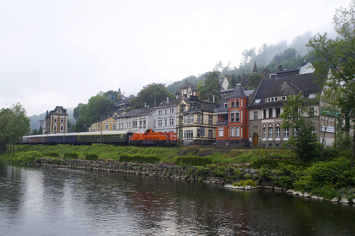 Ein Blick von der Burg Altena nach Süden auf einen Autozug, den eine unbekannte 185 am 20.01.2024 auf der Ruhr-Sieg-Strecke (wahrscheinlich) nach Emden befördert. Altena war ein wichtiger Standort der Draht- und Metallindustrie und zwischen 1887 und 1961 Endpunkt der aus Lüdenscheid kommenden meterspurigen Kreis-Altenaer Eisenbahn, an die zahlreiche Industriebetriebe im Rahmetal angeschlossen waren. Die KAE-Strecke lag auf der linken Seite der oberhalb der Ruhr-Siegstrecke führenden B 236, etwa in Höhe der Lennebrücke befand sich der Haltepunkt Mittlere Brücke. Bis 1969 war die Stadt Sitz des Kreises Altena, daran erinnert das rechts oben sichtbare Alte Kreishaus mit dem modernen Anbau. Horst Lüdicke