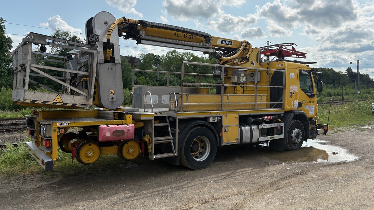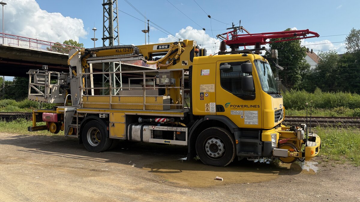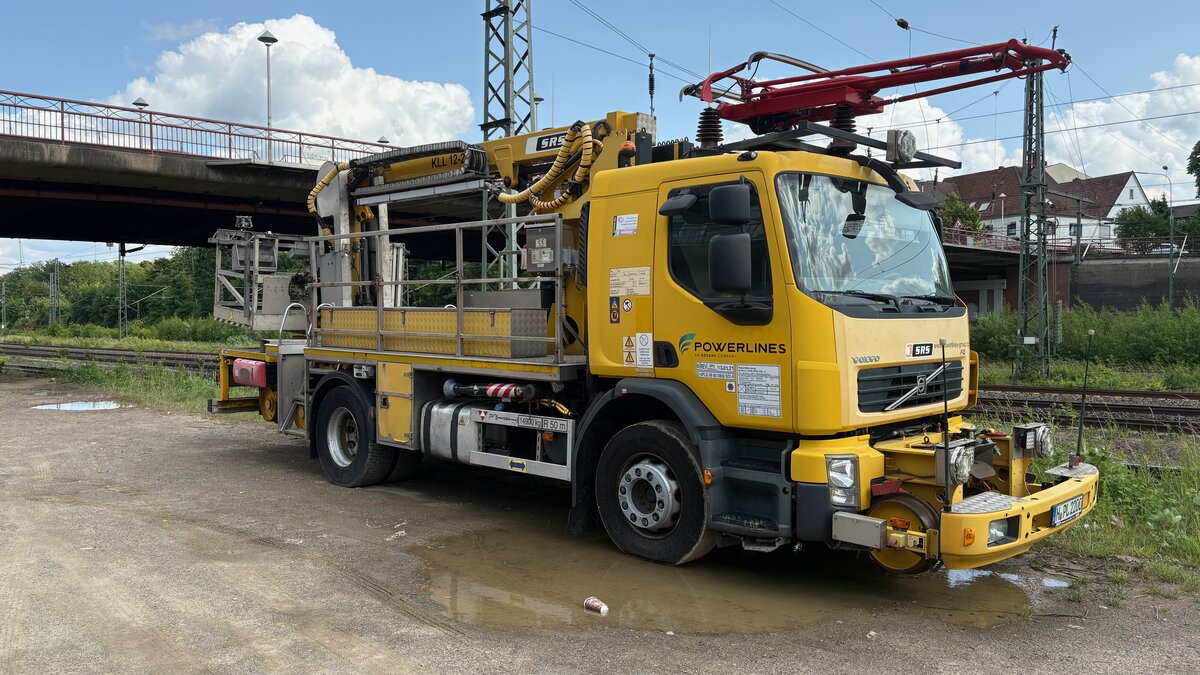 Ein Zweiwege-Volvo mit Hebebühne und Stromabnehmer für den Oberleitungsbau. Aufgenommen am 06.06.2025 auf einem Parkplatz am Bahnhof Löhne (Westf.) Tristan