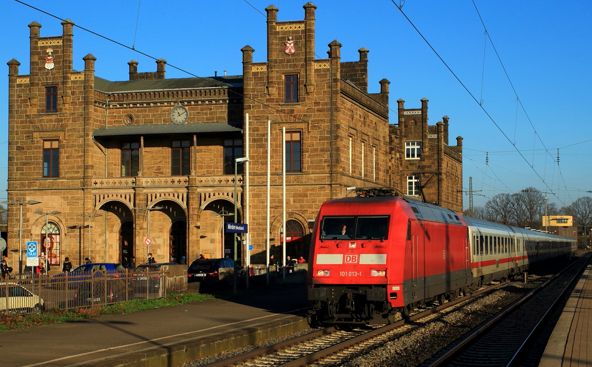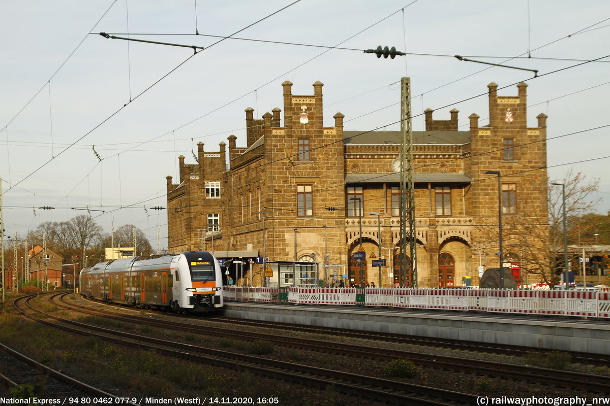 Hier zu sehen ist 462 077, welcher hier vor dem Mindener Bahnhofsgebäude steht und auf seine Abfahrt in Richtung Köln/Bonn Flughafen wartet DU-DV 3021