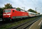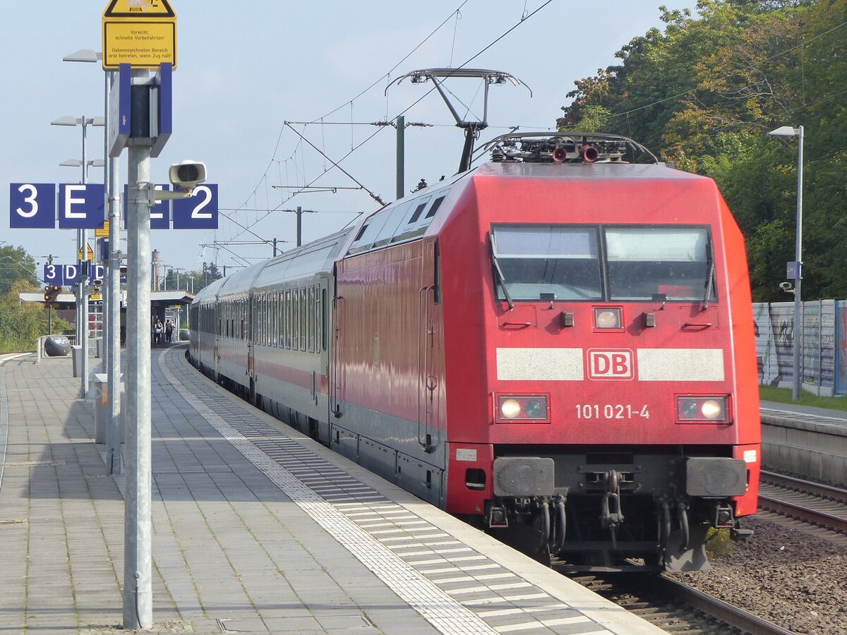 DB Fernverkehr 101 082 mit IC 2313 Hamburg-Altona - Offenburg Hbf, Umleiter (Frille, 27.08.2021). Aufgrund einer Oberleitungsstörung zwischen Sagehorn und Ottersberg (Strecke Bremen - Hamburg) wurde der Fernverkehr (IC, ICE, Flixtrain) zwischen Hamburg und Köln über Rotenburg (Wümme) - Verden - Nienburg - Minden - Hamm bzw. Gegenrichtung umgeleitet. Der Fotostandpunkt befindet sich an dem eingleisigen Teilstück Nienburg - Minden ("NATO-Bahn"). Der hier sonst in jede Richtung zweistündlich verkehrende RE 78 "Porta-Express" wurde wegen Auslastung dieses Teilstücks auf SEV umgestellt. Reinhard Kühn