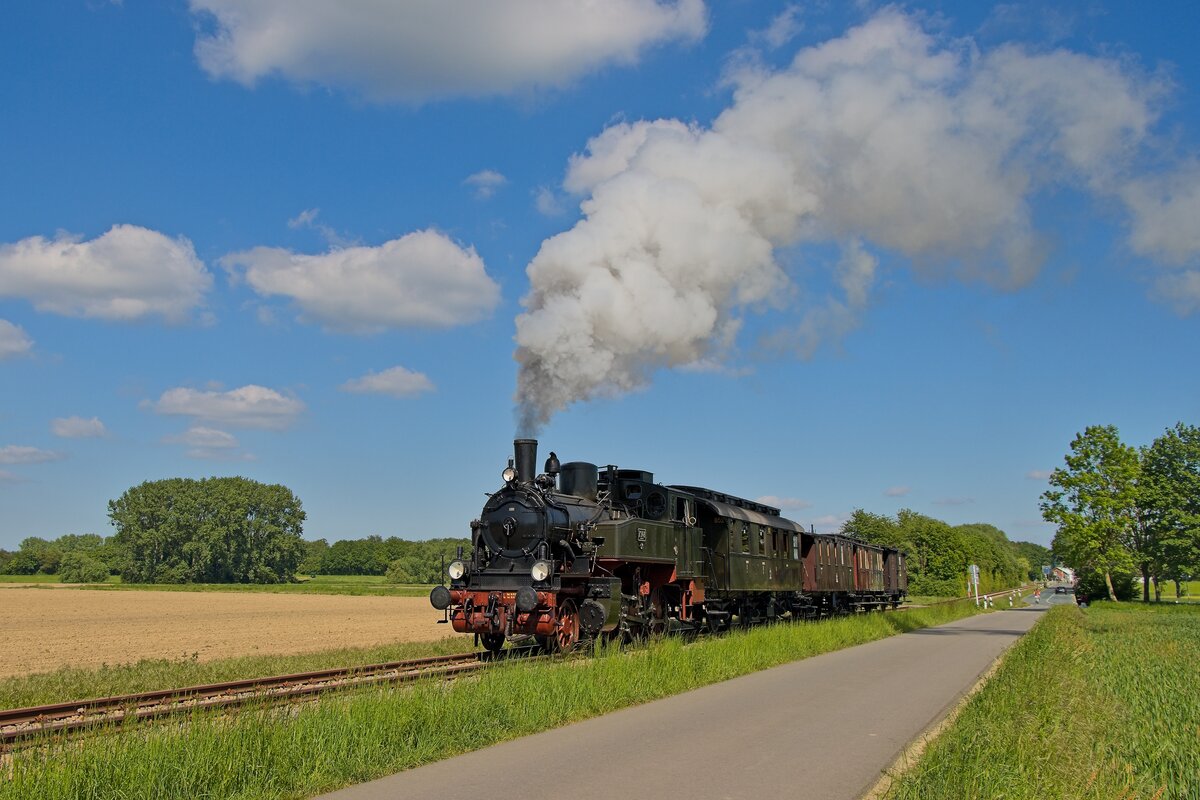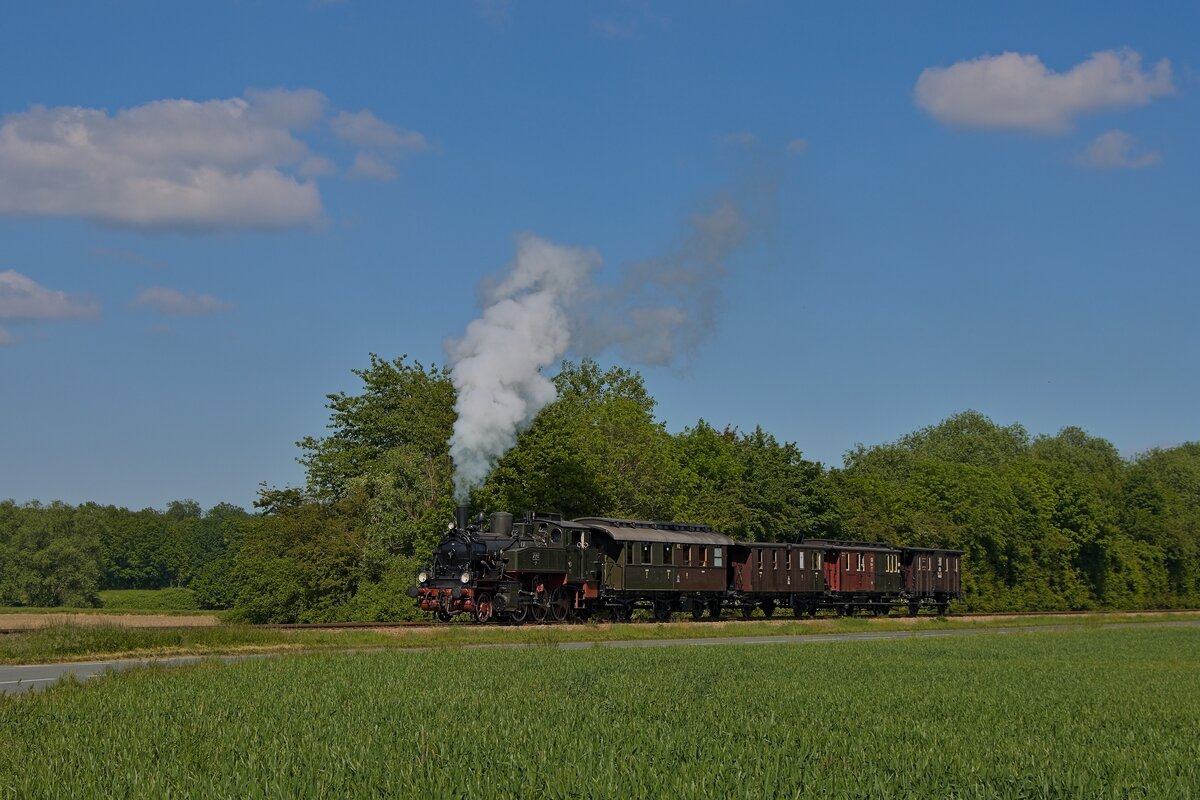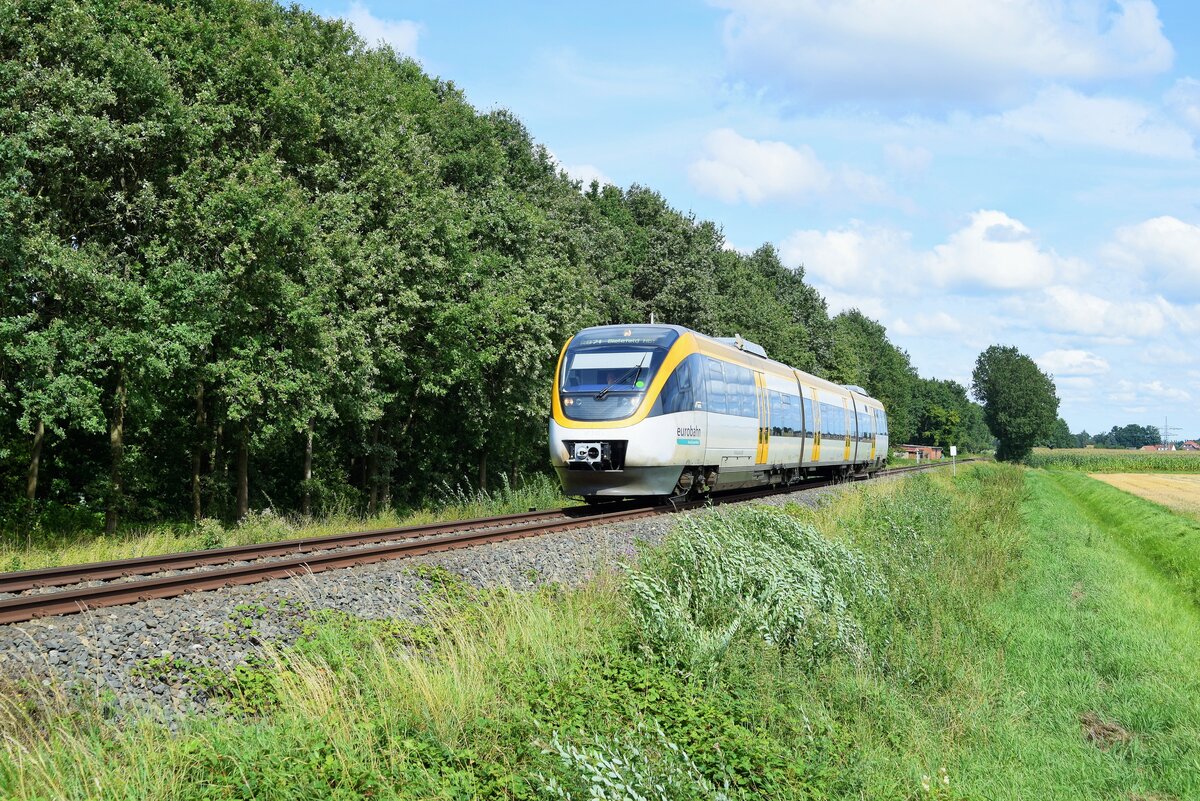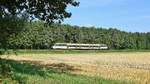 DB Fernverkehr Tz 184 (401 084/584) "Bruchsal", es führt 401 584, als IC 208 Basel SBB - Kiel Hbf, Umleiter (Frille, 27.08.2021). Aufgrund einer Oberleitungsstörung zwischen Sagehorn und Ottersberg (Strecke Bremen - Hamburg) wurde der Fernverkehr (IC, ICE, Flixtrain) zwischen Hamburg und Köln über Rotenburg (Wümme) - Verden - Nienburg - Minden - Hamm bzw. Gegenrichtung umgeleitet. Der Fotostandpunkt befindet sich an dem eingleisigen Teilstück Nienburg - Minden ("NATO-Bahn"). Der hier sonst in jede Richtung zweistündlich verkehrende RE 78 "Porta-Express" wurde wegen Auslastung dieses Teilstücks auf SEV umgestellt. Reinhard Kühn
