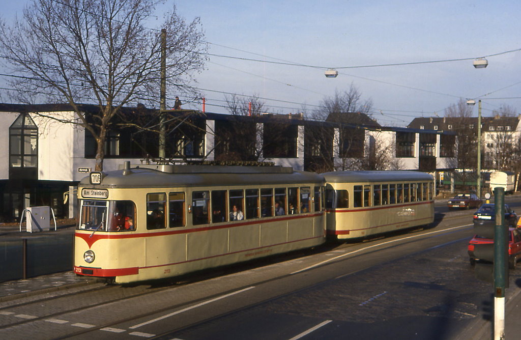 Die Anschlüsse in Düsseldorf-Lierenfeld sind nur über eine Spitzkehre an der Bruchstraße erreichbar. Damit die Rückfahrt nach Derendorf mit der Lok an der Spitze befahren werden kann, wird der aus Lierenfeld kommende Zug bis dorthin von der ganz im Hintergrund sichtbaren 261 109-3 geschoben. Ein Rangierer sichert derweil die Kreuzung mit der Vennhauser Straße. Horst Lüdicke