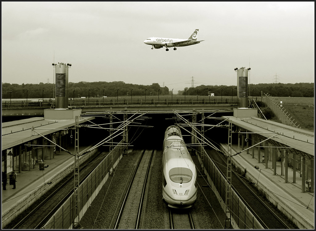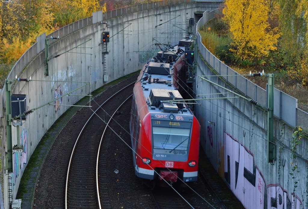 Eine S11 nach Bergisch Gladbach ist hier beim Verlassen vom Flughafen Düsseldorf an der Unterführung des Kieshecker Weg und der S-Bahnstrecke und Fernbahn nach Duisburg. Sonntag 11.11.2012 Andreas Strobel