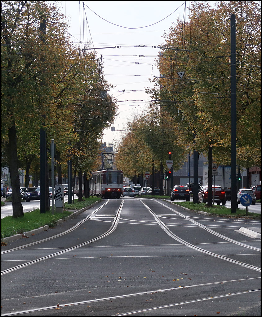 Nachschuß auf den Straßenbahnzug 3373 der Rheinbahn als Linie 715 in Richtung Innenstadt fahrend am Kuthsweg zu sehen ist. Freitag 21.3.2014 Andreas Strobel