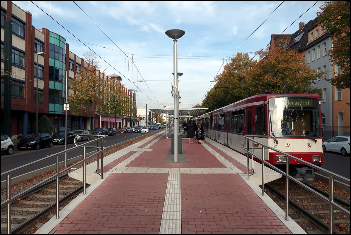 Blick vom östlichen Zugang der Haltestelle Betriebshof Lierenfeld nach Südosten. Der Stadtbahnzug auf der U75 verlässt die lange straßenbündige Strecke von Eller her und fährt in den Bahnkörper der Erkrather Straße ein. Die Abzweige führen zum Betriebshof.
