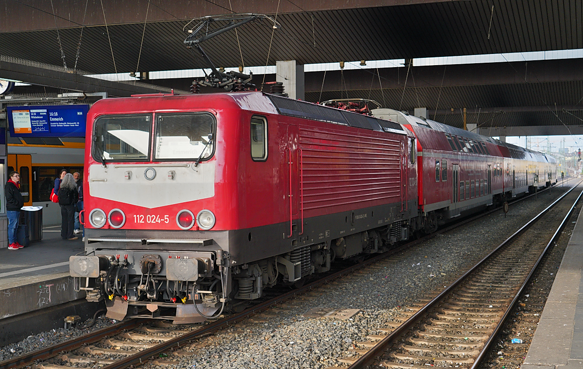 185 394 beschleunigt mit ihrem RE3 Ersatzzug bei Angermund in Richtung Düsseldorf nachdem sie die Langsamfahrstelle passiert hat. Aufgenommen vom Bahnsteigende.