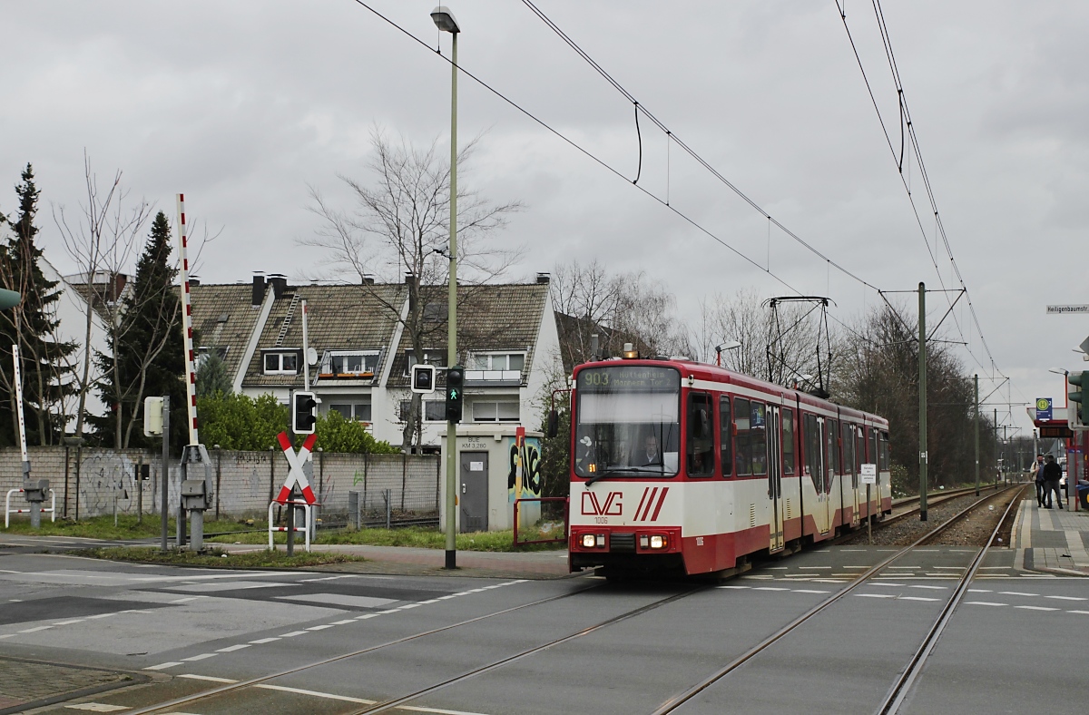 Wahrscheinlich muss man sich die Beine in den Bauch stehen, um an der Strecke von Duisburg-Hochfeld Süd nach Duisburg-Hüttenheim Güterzug und Straßenbahn gemeinsam aufs Bild zu bekommen, mir ist es jedenfalls nicht gelungen, deshalb blieb es bei dieser Aufnahme des DVG-Triebwagens 1006 auf der Kreuzung Ehinger Straße/Heiligenbaumstraße mit dem Bahnübergang im Hintergrund (18.02.2020) Horst Lüdicke