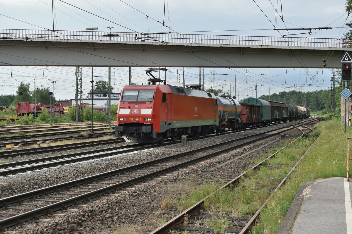 Noch so ein Schmanckerl des Tages war dieser Zug der EFW der von der 212 370-1 und 215 028-4 samt einem Flachwagenzug gen Lintorf durch Duisburg Entenfang. 2.6.2018 Andreas Strobel