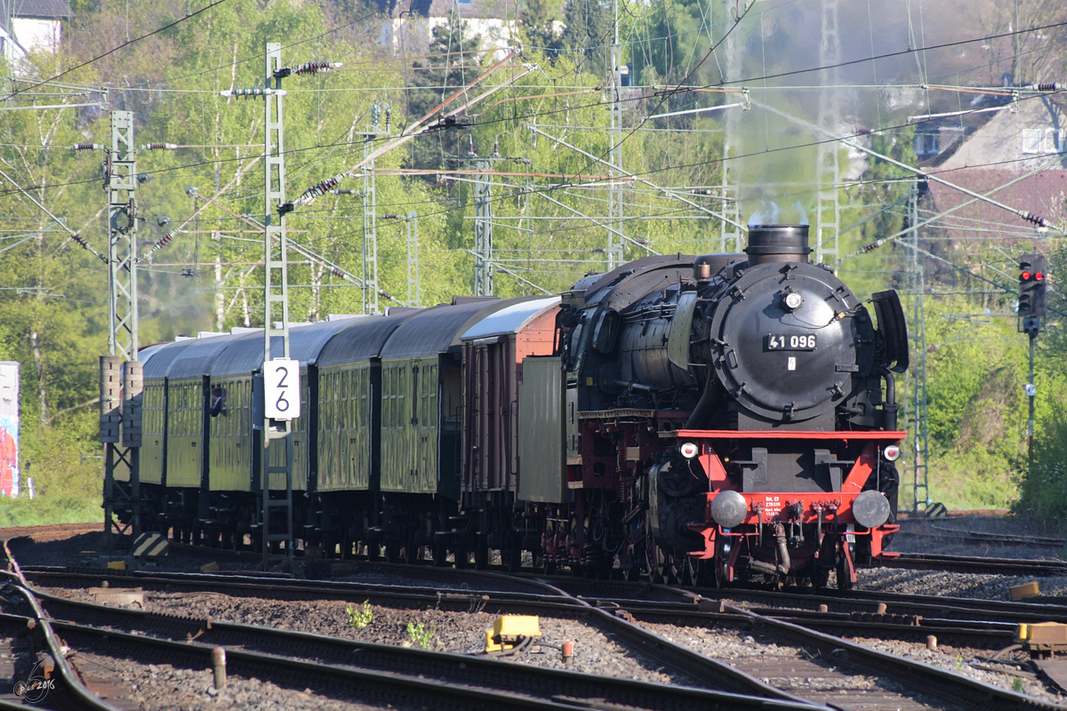 Die Dampflokomotive 41 096 bei der Ausfahrt aus dem Bahnhof Essen-Steele Ost. (April 2017)