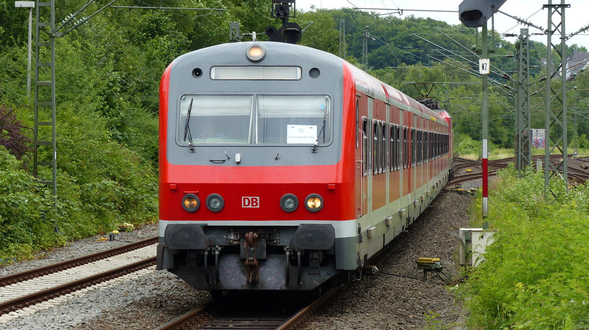 Die S1 in Richtung Solingen fährt gerade aus Dortmund kommend in den Bahnhof Essen-Steele Ost ein. (April 2017)
