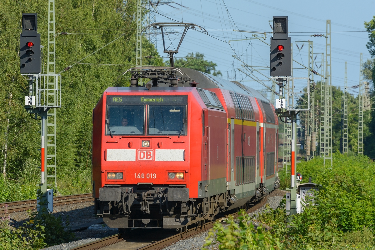 Die schon arg verwitterte 111 120-2 fährt am 06.07.2015 mit einem HVZ-Verstärkerzug in den Bahnhof von Dinslaken ein.
