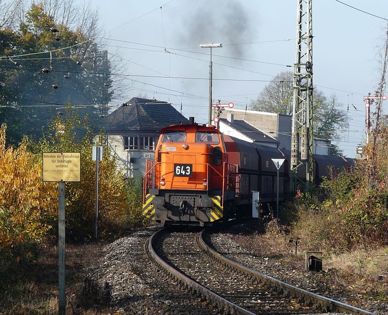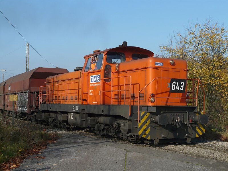 Diese Lokomotive zieht leere Wagen in Richtung Zeche Kamp-Lintfort. Das Bild stammt vom 04.11.2008