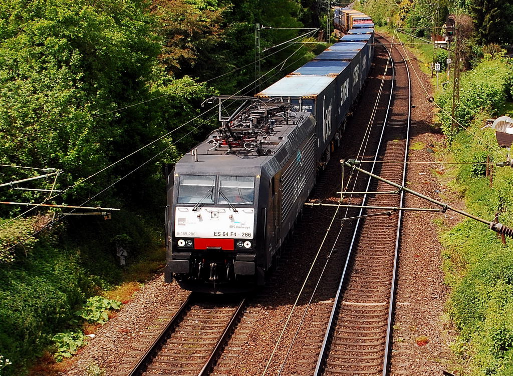 Von Viersen kommend in Richtung Mönchengladbach fahrend ist die ERS 189 286 mit einem Containerzug am Haken in Eicken unterwegs. Das Bild ist von der Brücke der Hohenzollernstraße gemacht......bis zum Mai 1909 lagen auf dieser Straße Schienen der Rheinischen Eisenbahn, danach führte die Strecke einige Meter weiter westlich an Eicken vorbei nach Rheydt-Morr. Auf den Karten kann man die Linienführung der Stillgelegten Strecken in Rheydt und Mönchengladbach gut erkennen.