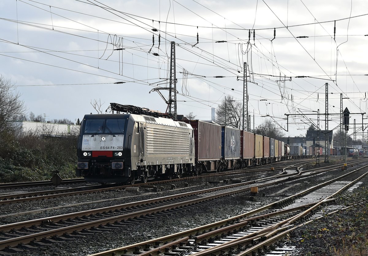 E189 283 von MRCE mit einem Kastelzug durch Grevenbroich gen Rheydt fahrend am Samstag den 9.12.2017. Im Hintergrund erkennt man noch zwei 644ziger an ihrem letzen Diensttag an den Bahnsteigen Gleis 2 und Gleis 3 stehen. Andreas Strobel