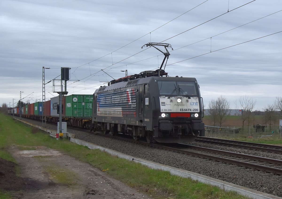 Chengdu-Tilburg-Rotterdam Express steht auf der 189 200 die mit einem Containerzug gen China bei Gubberath am Abend des 12.3.2019 unterwegs. Andreas Strobel