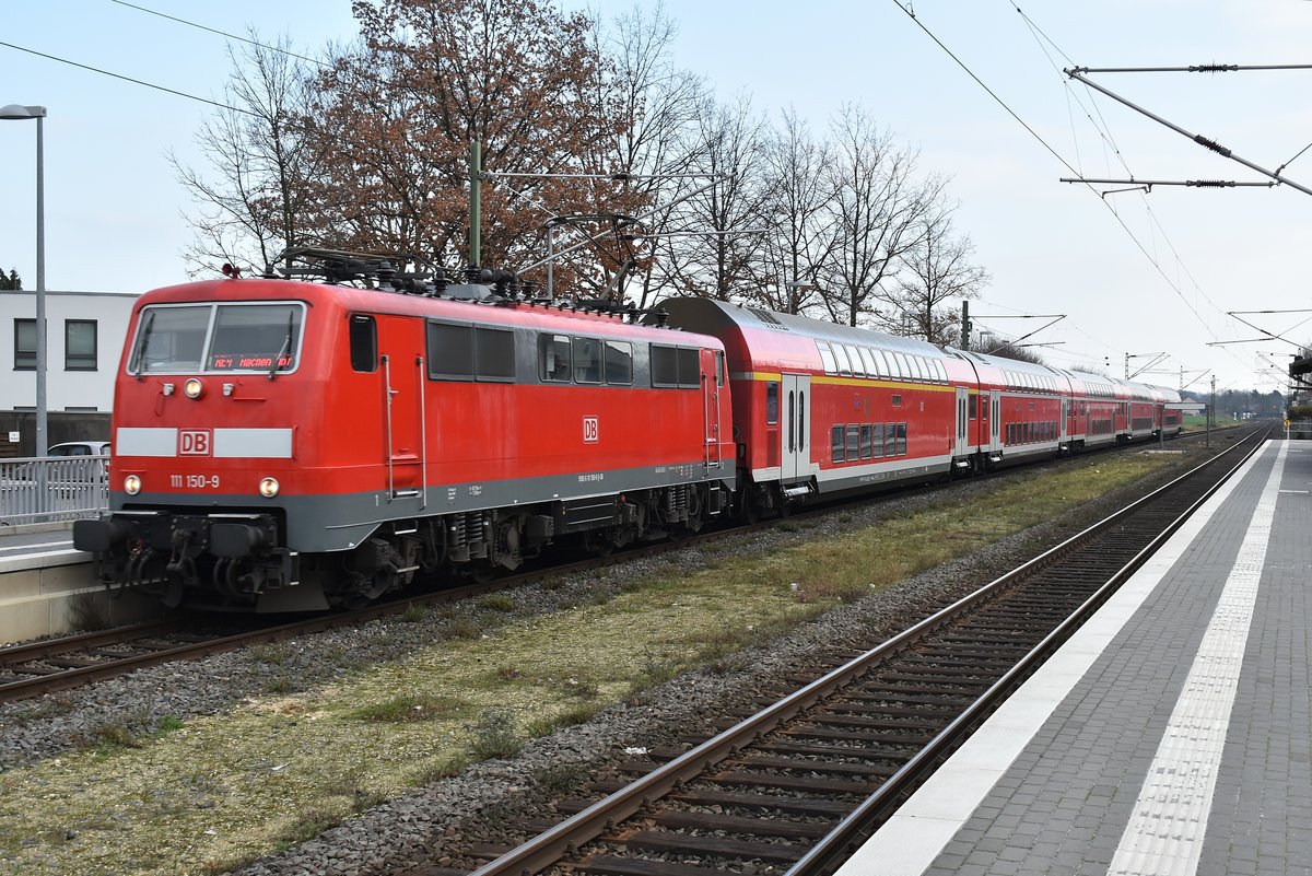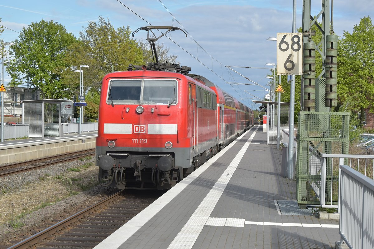 Auch dieser RE4 fährt nur bis Düsseldorf Hbf, wegen der Baustelle in Wuppertal, der hier von der 111 119 durch Korschenbroich geschoben wird. 23.4.2017 Andreas Strobel