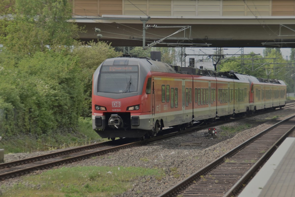 1428 502 bringt hier einen RE42 aus Mönchengladbach durch Korschenbroich gen Münster Hbf, wegen Bauarbeiten in zwischen Viersen und Mönchengladbach Hbf ist der Zug als Umleiter bis Uerdingen unterwegs. Sonntag den 22.4.2018 Andreas Strobel