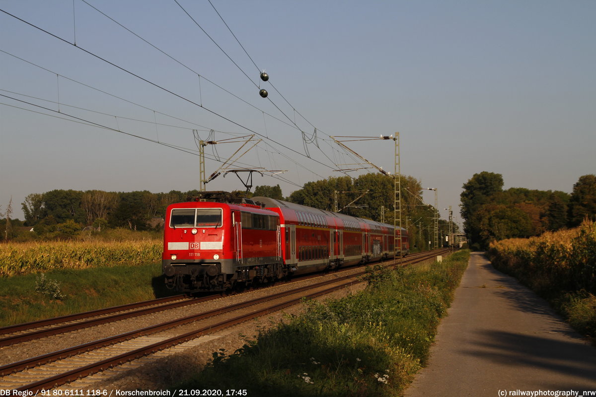 Abendlicher Nachschub ist hier in Form der 111 143-4 mit einem RE4 nach Dortmund, kurze Zeit nach dem der Regen durch war, kam schon wieder die Sonne und erhellte den Fotostandort Korschenbroich Bahnhof. 9.8.2018 Andreas Strobel