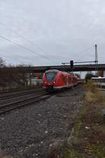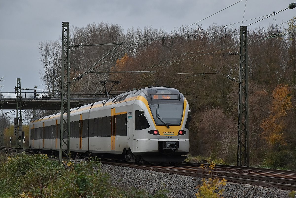 Nachschuß auf den Eurobahn ET 7.09 nach Venlo der am 1.12.2018 wegen Bauarbeiten in den Gleiswechselbetrieb auf das Richtungsgleis Neuss, da auf dem Gleis nach Mönchengladbach Kleineisen getauscht wurden. Hier ist der Zug in Kleinenbroich. Andreas Strobel
