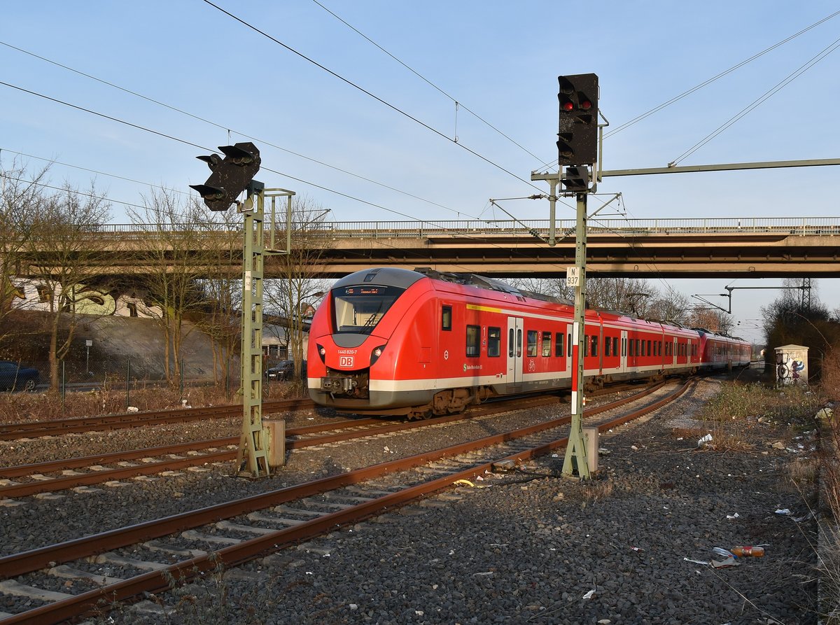 Nachschuß auf die S8 nach Wuppertal-Barmen, an dessen Ende der 1440 820-7 zu sehen ist. Aufgenommen ist das Bild am Donnerstag den 1.3.2018 im besten Abendlicht. Andreas Strobel