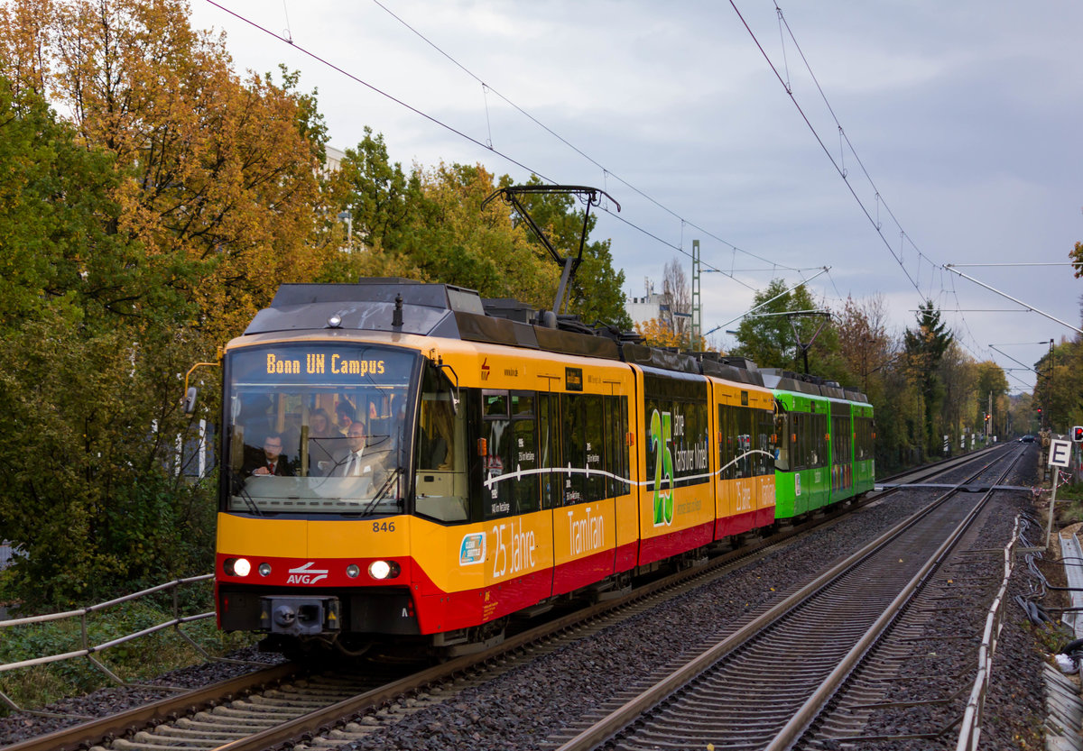 Anlässlich einer Sonderfahrt zum UN-Weltklimagipfel schickte die Albtal-Verkehrs-Gesellschaft mbH am 5. November 2017 die beiden Zweisystemwagen 846 und 914 als SDZ 20061 über DB-Gleise von Karlsruhe über Frankfurt am Main zum kurz zuvor eröffneten Haltepunkt Bonn UN-Campus. Mit im Fahrzeug waren unter anderem Baden-Württembergs Verkehrsminister Winfried Hermann, sowie Karlsruhes Oberbürgermeister Dr. Frank Mentrup. Hier sind sie bei der Einfahrt in den Bahnhof Bonn UN-Campus zu sehen. Henri Kliemt