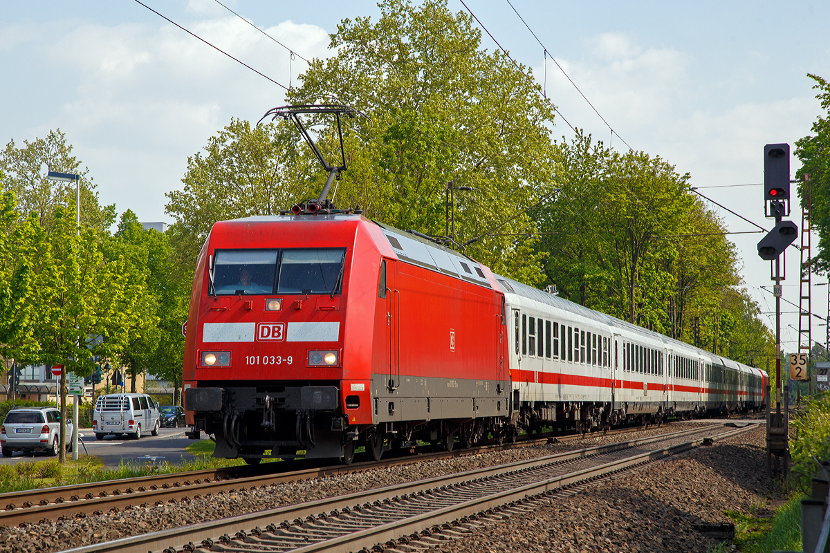 Der IC 2004 "Schwarzwald" (Konstanz - Koblenz - Köln - Emden Hbf) fährt am 30.04.2019, im Sandwich mit der Zuglok 101 033-9 und der Schublok 101 012-3 durch Bonn-Gronau (nähe dem Bf Bonn UN Campus) in Richtung Bonn Hbf. Armin Schwarz