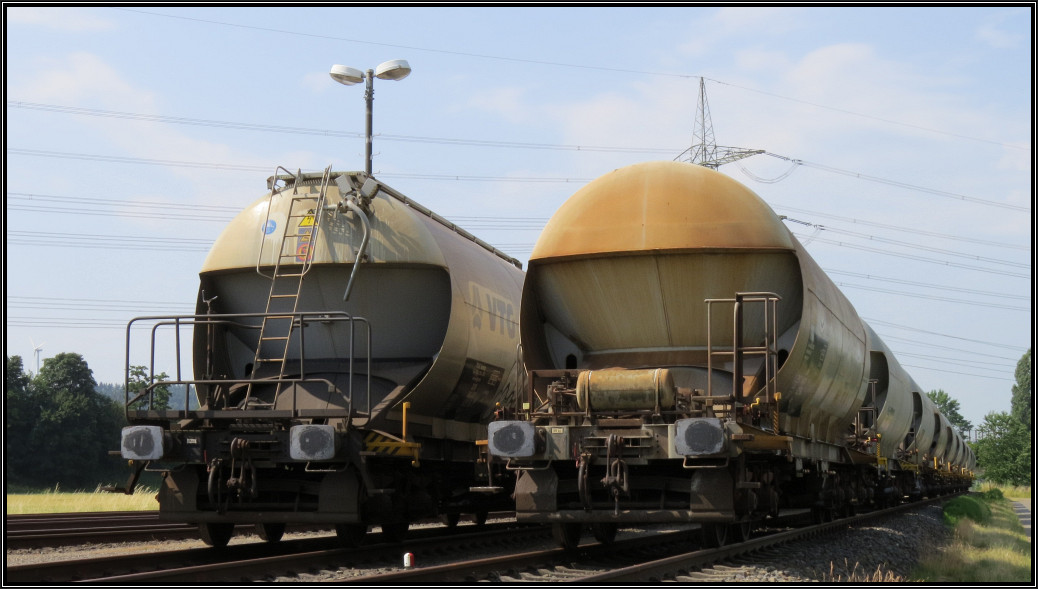 Sonntagsruhe in Frenz bei Weisweiler. Hier stehen Staubsilowaggons mit Kalksteinmehl beladen und warten auf ihre Entladung. Szenario bildlich festgehalten vom Weg aus am 05.Juli 2015. Stefan Jakab